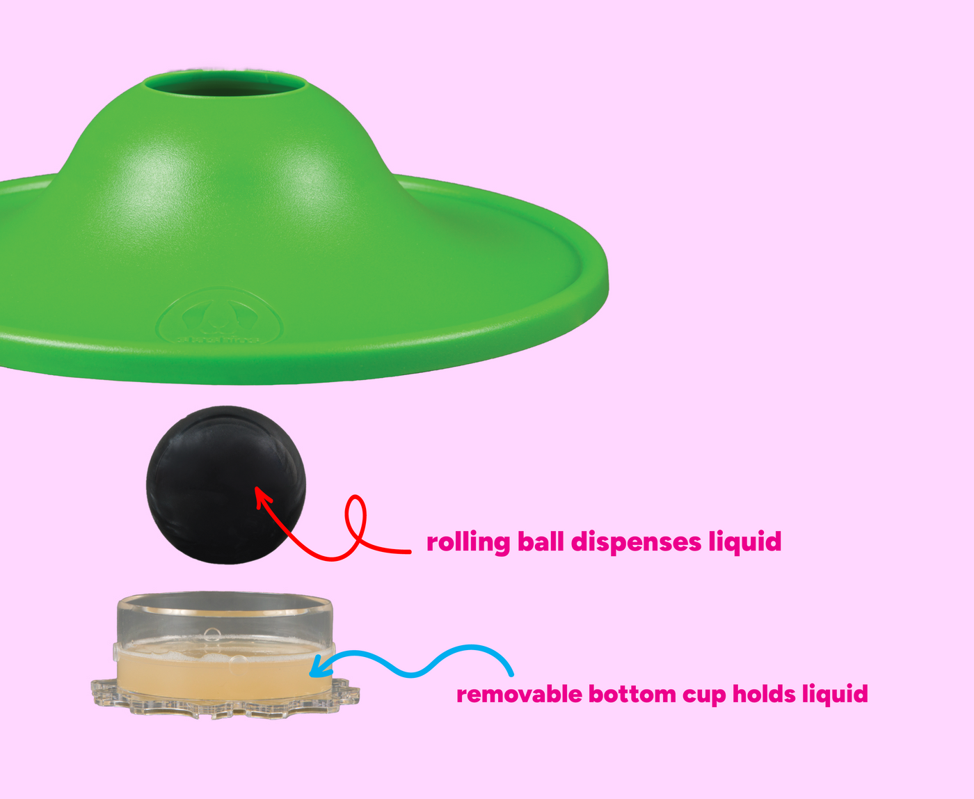 The bottom cup holds Soothing Sauce OR any liquid treat your pet prefers, once your pet starts licking the rolling ball dispenses the liquid.